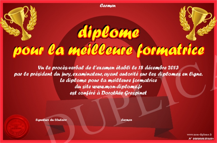 Envoyez par email votre diplome pour la meilleure formatrice personalisé