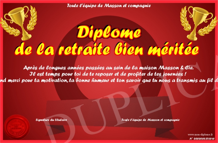 Envoyez par email votre Diplôme de la retraite bien méritée personalisé