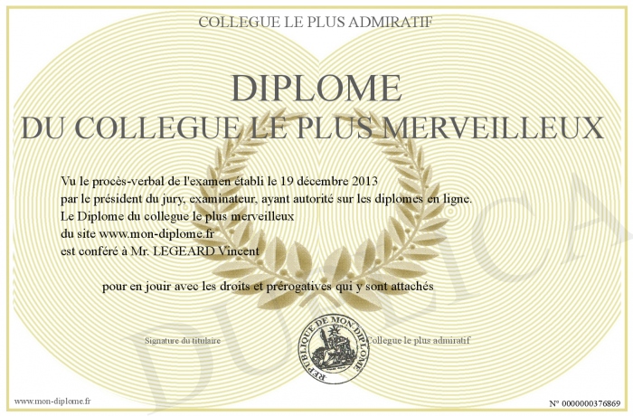 Envoyez par email votre Diplôme du collegue le plus merveilleux personalisé