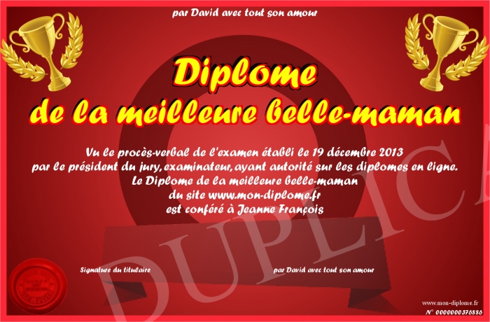 Envoyez par email votre Diplôme de la meilleure belle-maman personalisé