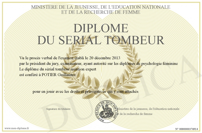 Envoyez par email votre Diplôme du sérial tombeur personalisé