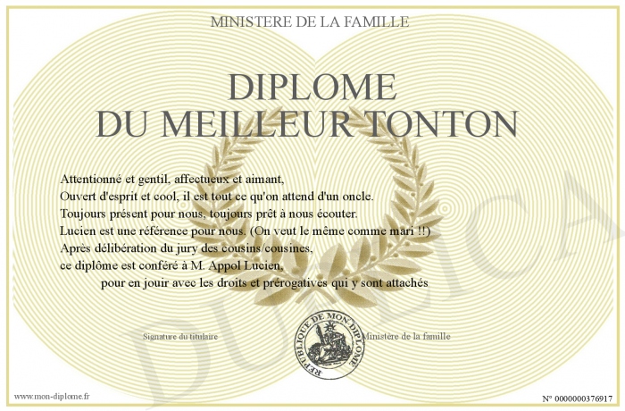 Envoyez par email votre Diplôme du meilleur tonton personalisé