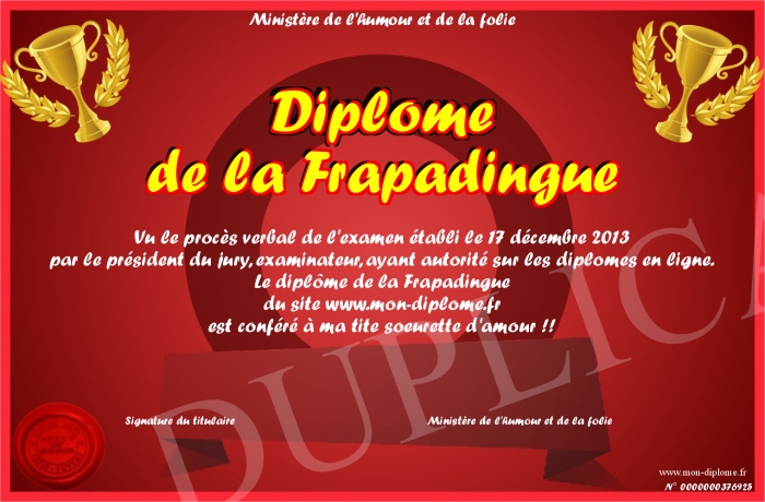 Envoyez par email votre Diplôme de la Frapadingue personalisé