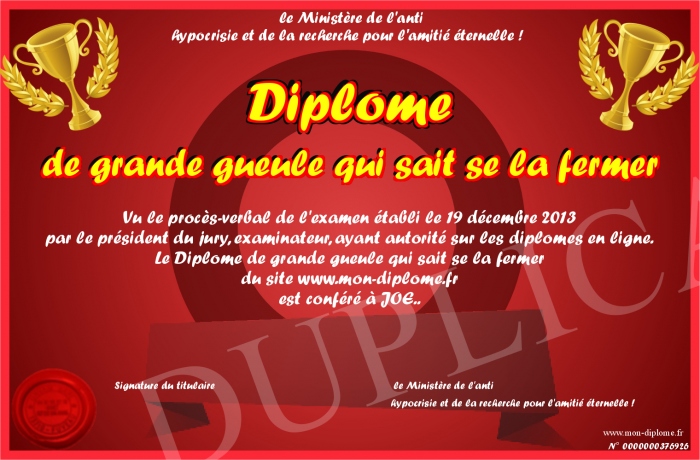 Envoyez par email votre Diplôme de grande gueule qui sait se la fermer personalisé