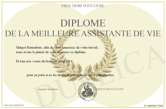 Envoyez par email votre Diplôme de la meilleure assistante de vie personalisé