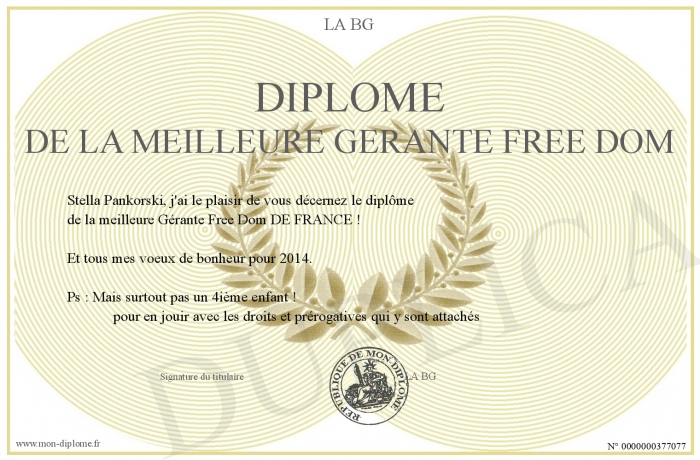 Envoyez par email votre Diplôme de la meilleure Gérante FREE DOM personalisé