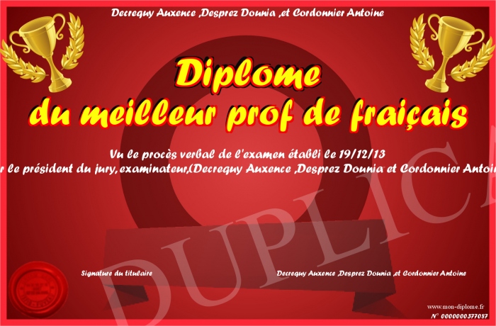 Envoyez par email votre Diplôme du meilleur prof de fraiçais personalisé