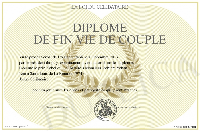 Envoyez par email votre Diplôme de fin vie de couple personalisé