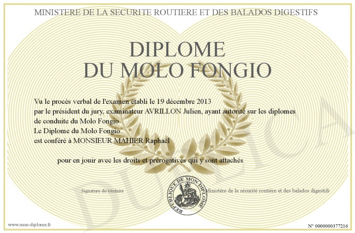Envoyez par email votre Diplôme du Molo Fongio personalisé