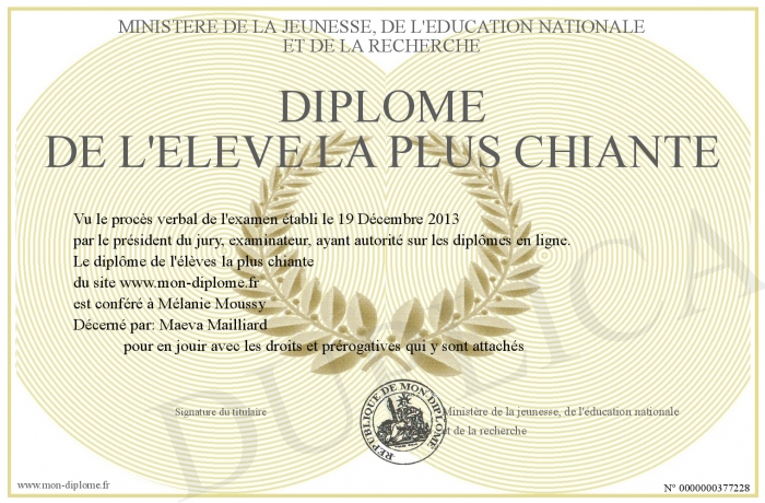 Envoyez par email votre Diplôme de l'élève la plus chiante personalisé