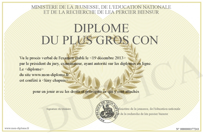 Envoyez par email votre Diplôme du plus gros con personalisé