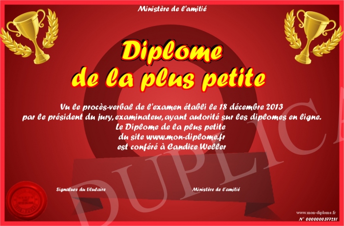 Envoyez par email votre Diplôme de la plus petite personalisé