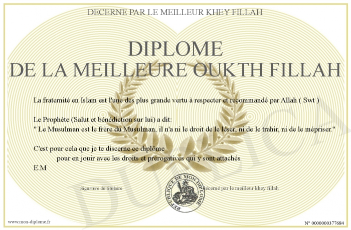 Envoyez par email votre Diplôme de la meilleure Oukth fillah personalisé