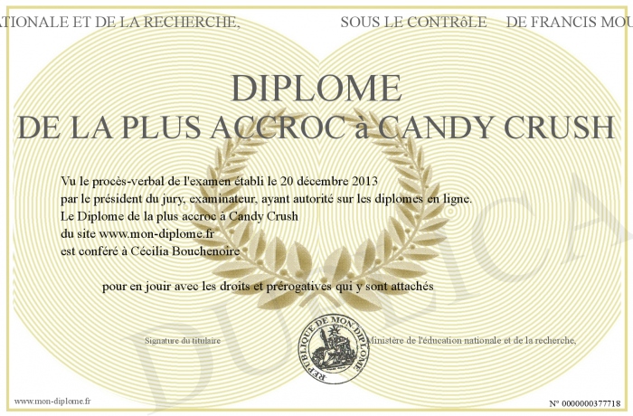 Envoyez par email votre Diplôme de la plus accroc à Candy Crush personalisé