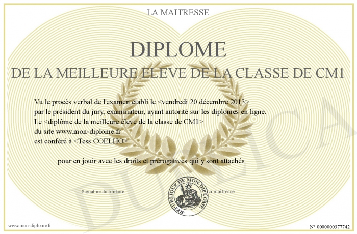 Envoyez par email votre Diplome de la meilleure élève de la classe de CM1 personalisé