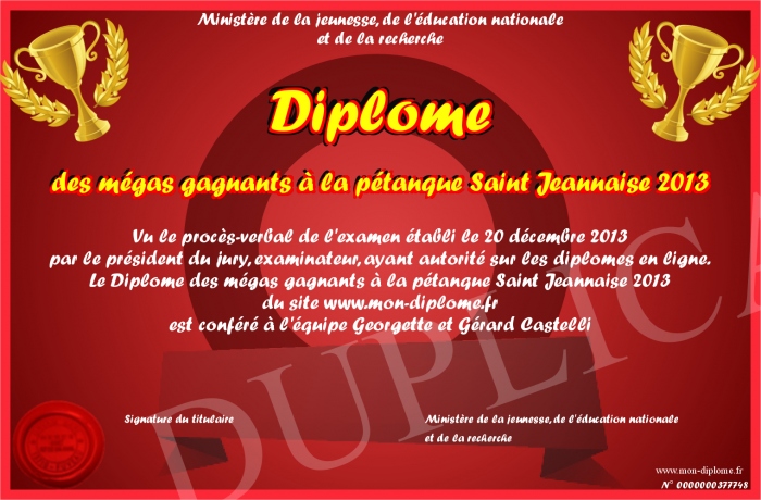 Envoyez par email votre Diplôme des mégas gagnants à la pétanque Saint Jeannaise 2013 personalisé