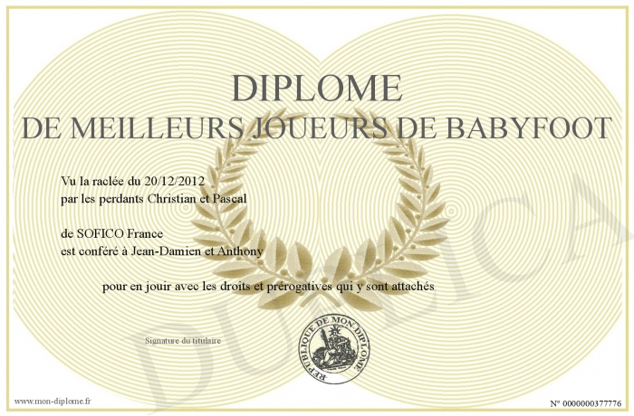 Envoyez par email votre Diplôme de meilleurs joueurs de Babyfoot personalisé