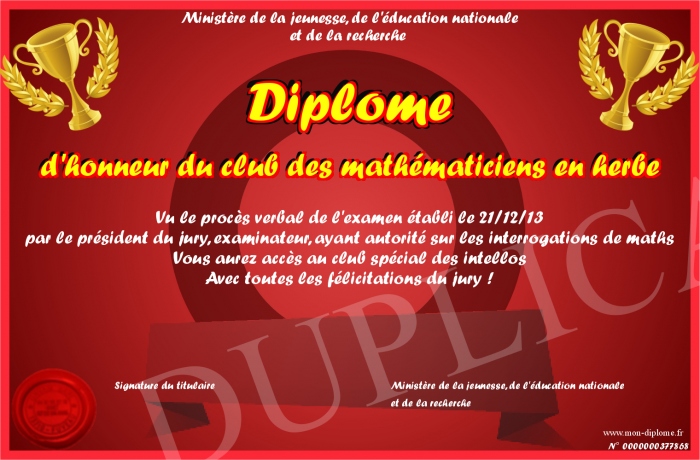 Envoyez par email votre Diplôme d'honneur du club des mathématiciens en herbe personalisé