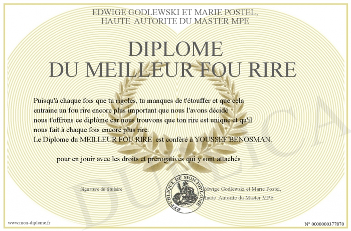 Envoyez par email votre Diplôme du MEILLEUR FOU RIRE personalisé