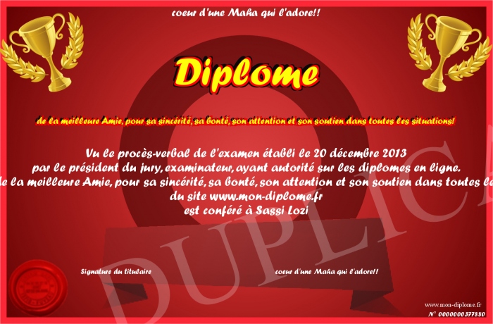 Envoyez par email votre Diplôme de la meilleure Amie, pour sa sincérité, sa bonté, son attention et son soutien dans toutes les situations! personalisé
