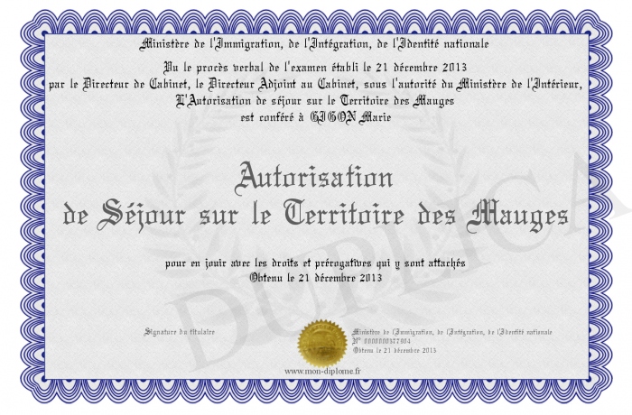 Envoyez par email votre Autorisation de Séjour sur le Territoire des Mauges personalisé