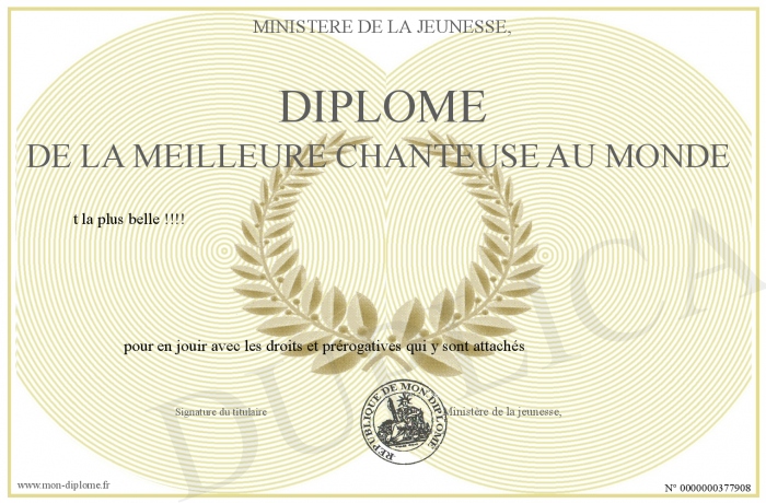 Envoyez par email votre Diplôme de la meilleure chanteuse au monde personalisé