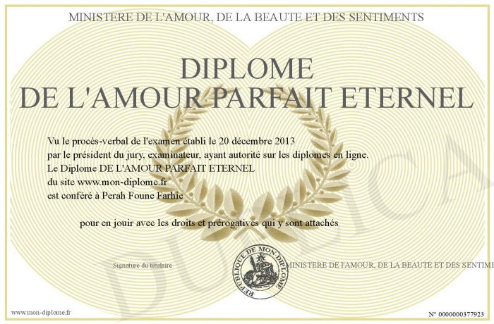Envoyez par email votre Diplôme DE L'AMOUR PARFAIT ETERNEL personalisé