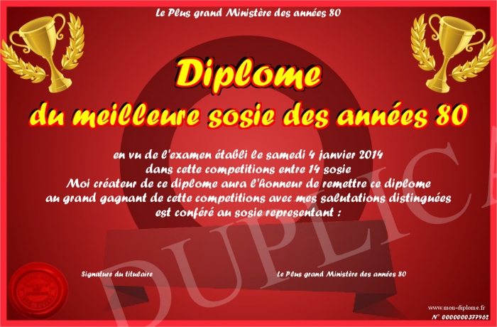 Envoyez par email votre Diplôme du meilleure sosie des années 80 personalisé