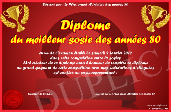 Envoyez par email votre Diplôme du meilleur sosie des années 80 personalisé
