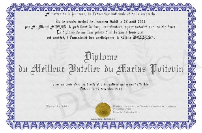 Envoyez par email votre Diplôme du Meilleur Batelier du Marias Poitevin personalisé