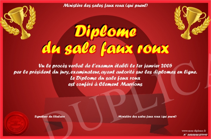 Envoyez par email votre Diplôme du sale faux roux personalisé