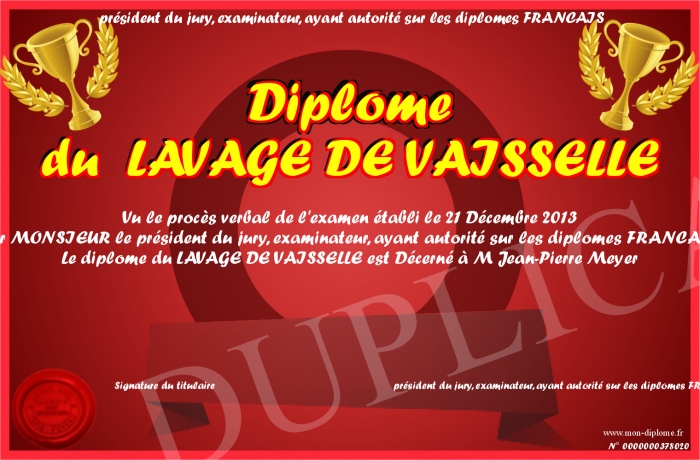 Envoyez par email votre Diplôme du LAVAGE DE VAISSELLE personalisé
