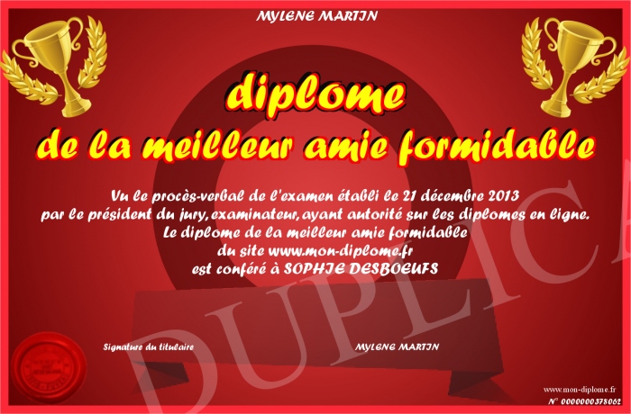 Envoyez par email votre diplome de la meilleur amie formidable personalisé