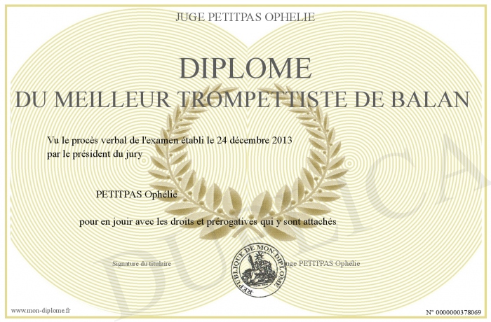 Envoyez par email votre Diplôme du meilleur trompettiste de Balan personalisé