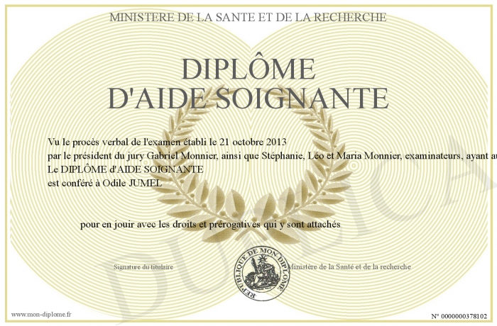 Envoyez par email votre DIPLÔME d'AIDE SOIGNANTE personalisé