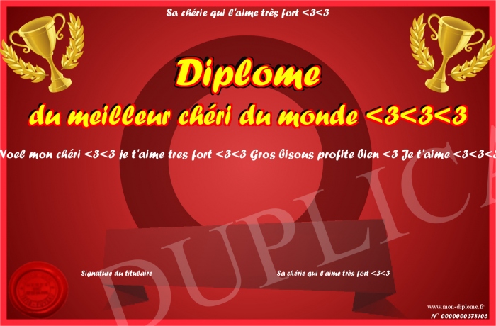 Envoyez par email votre Diplôme du meilleur chéri du monde -3-3-3 personalisé