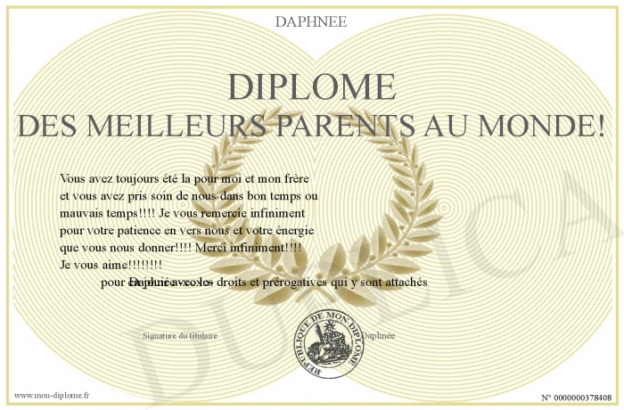 Envoyez par email votre Diplôme des meilleurs parents au monde! personalisé