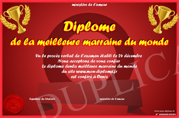 Envoyez par email votre Diplôme de la meilleure marraine du monde personalisé