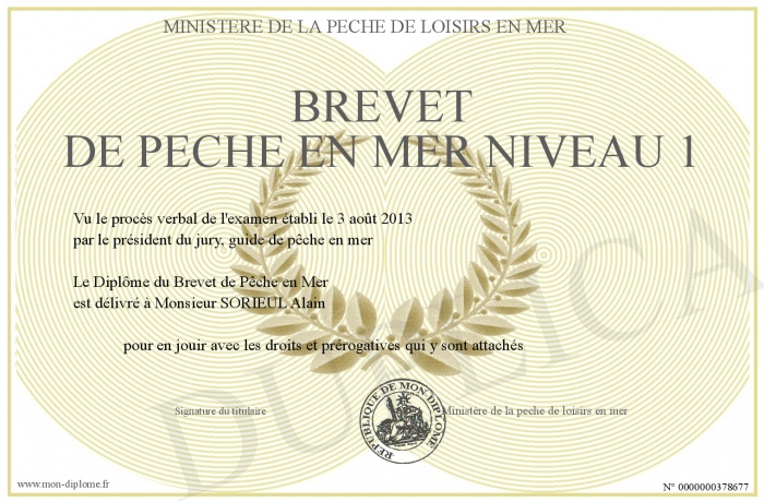 Envoyez par email votre BREVET DE PECHE EN MER niveau 1 personalisé