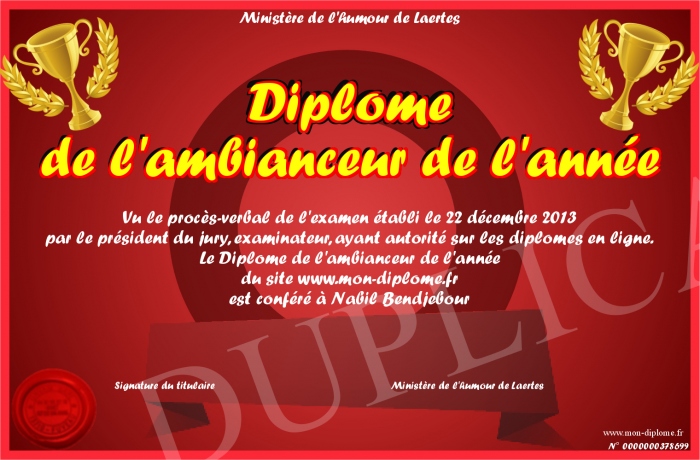 Envoyez par email votre Diplôme de l'ambianceur de l'année personalisé