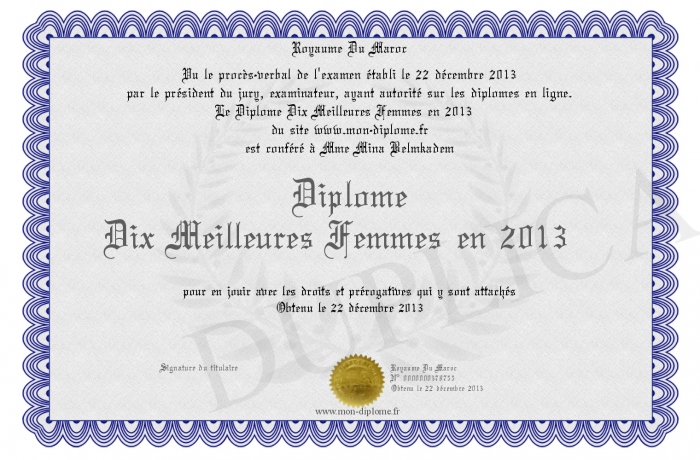 Envoyez par email votre Diplôme Dix Meilleures Femmes en 2013 personalisé
