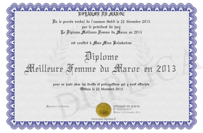 Envoyez par email votre Diplôme Meilleure Femme du Maroc en 2013 personalisé