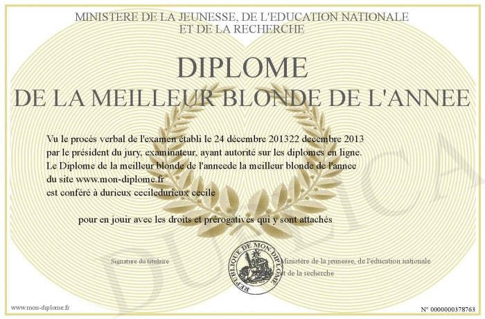 Envoyez par email votre Diplôme de la meilleur blonde de l'annee personalisé