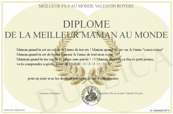 Envoyez par email votre Diplôme de la meilleur maman au monde personalisé