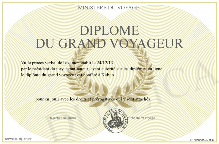 Envoyez par email votre Diplôme du Grand Voyageur personalisé