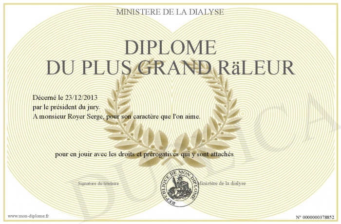 Envoyez par email votre Diplôme du plus grand räleur personalisé