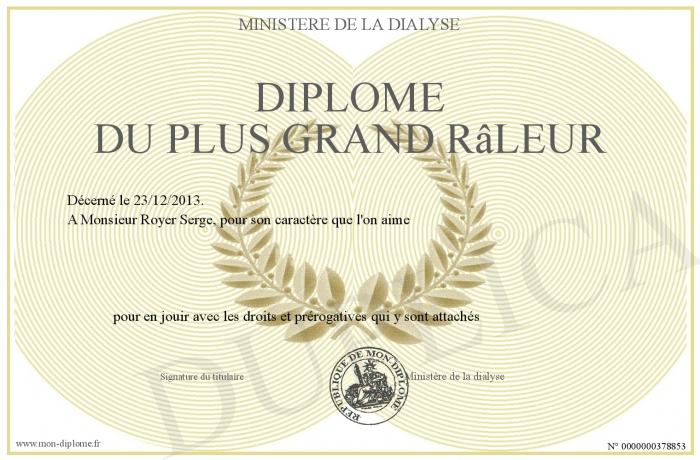 Envoyez par email votre Diplôme du plus grand râleur personalisé