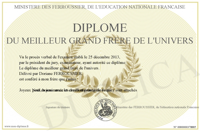 Envoyez par email votre Diplôme du meilleur grand frère de l'univers personalisé