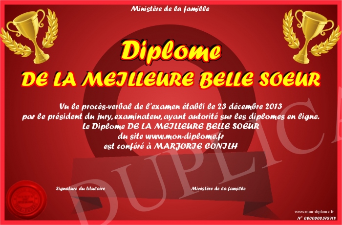 Envoyez par email votre Diplôme DE LA MEILLEURE BELLE SOEUR personalisé
