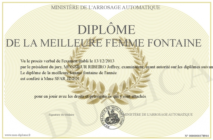 Envoyez par email votre DIPLÔME DE LA MEILLEURE FEMME FONTAINE personalisé